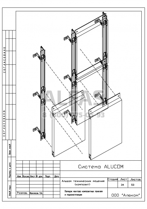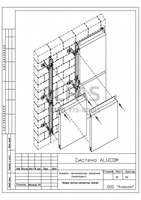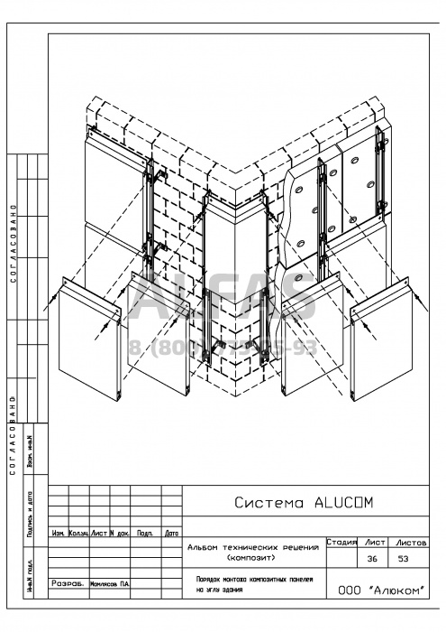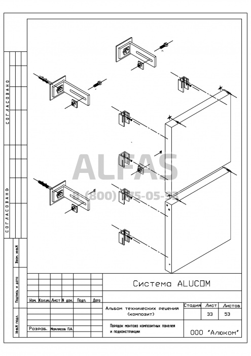 В системе Alucom KP крепление панелей облицовки осуществляется за счёт замка, образованного сочетанием скользящего кронштейна (салазки) и соединителя углового кассеты. При этом скользящие кронштейны (салазки) устанавливаются зеркально относительно друг друга, фиксируя облицовочную кассету в распор. Данный способ крепления обеспечивает высокую надёжность фиксации панели облицовки.