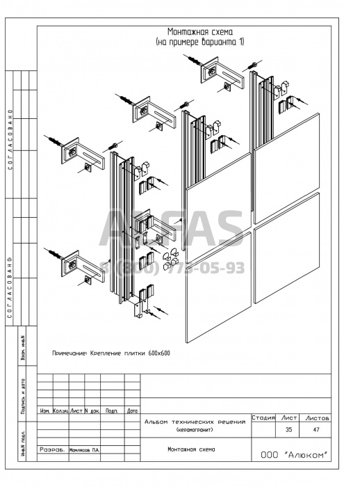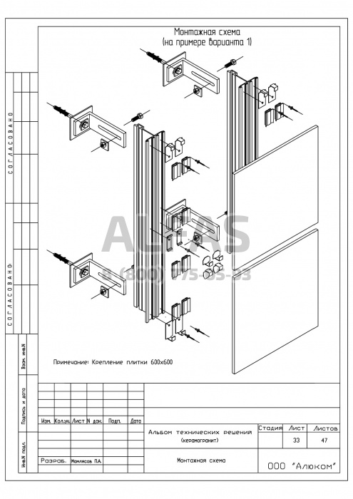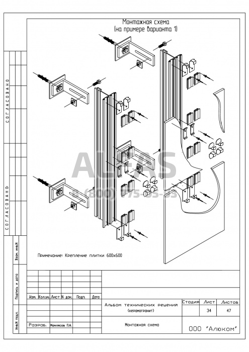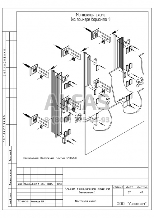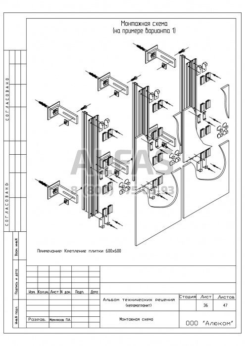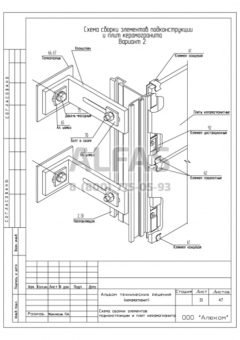 Alucom KG – алюминиевая подоблицовочная конструкция, выполненная из сплава А6063 Т6, обеспечиваемый диапазон регулировки относа от стены от 100 мм до 320мм. В качестве облицовки используются плиты из керамического гранита в диапазоне толщин 8-12мм. Крепление осуществляется открытым способом при помощи поворотного кляммера, изготовленного из нержавеющей стали 12Х18Н10Т.