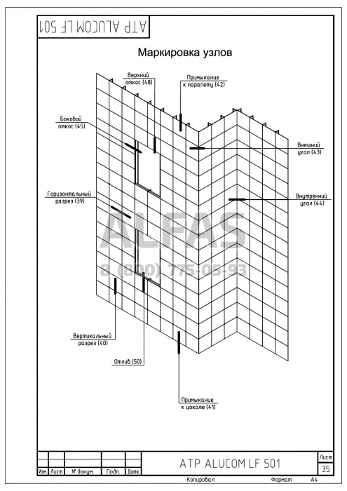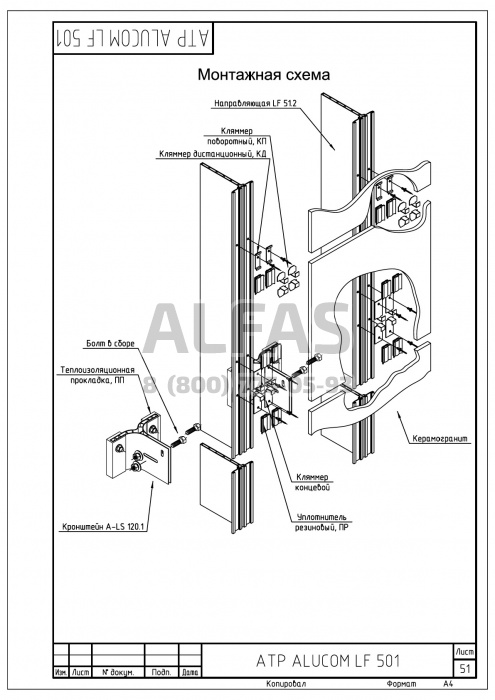 Крепление осуществляется открытым способом при помощи поворотного кляммера, изготовленного из нержавеющей стали 12Х18Н10Т. Alucom LF 501 можно использовать как в варианте с резиновыми уплотнителями, так и без них. В этом случае используется прижимной кляммер новой ОРИГИНАЛЬНОЙ КОНСТРУКЦИИ. Кляммеры могут, по желанию Заказчика, окрашиваться в цвет материала облицовки.