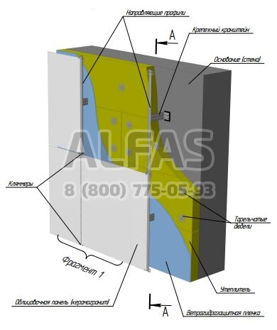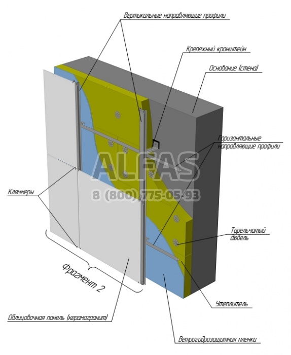 Кронштейны монтируют на несущую стену, с обязательной установкой термоизоляционной прокладки, с шагом по горизонтали от 600 мм до 800 мм и по вертикали от 600 мм до 1200 мм. В качестве вертикального применяют оцинкованный профиль Т-образного сечения различной ширины.