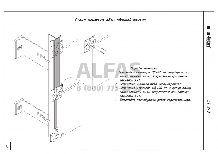 Система LT-247 предназначена для видимого крепления плоских облицовочных панелей: плиты керамического гранита, фиброцементные панели.