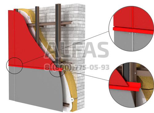 • Надежное крепление облицовки с помощью заклепок с широким бортиком повышает прочность фасада и обеспечивает надежность системы при больших ветровых нагрузках (особенно важно в высотном строительстве)