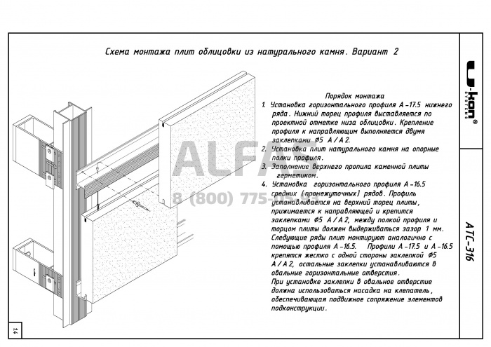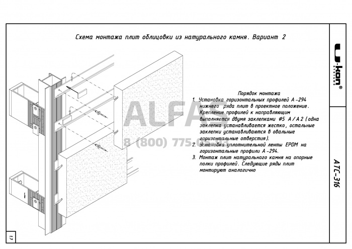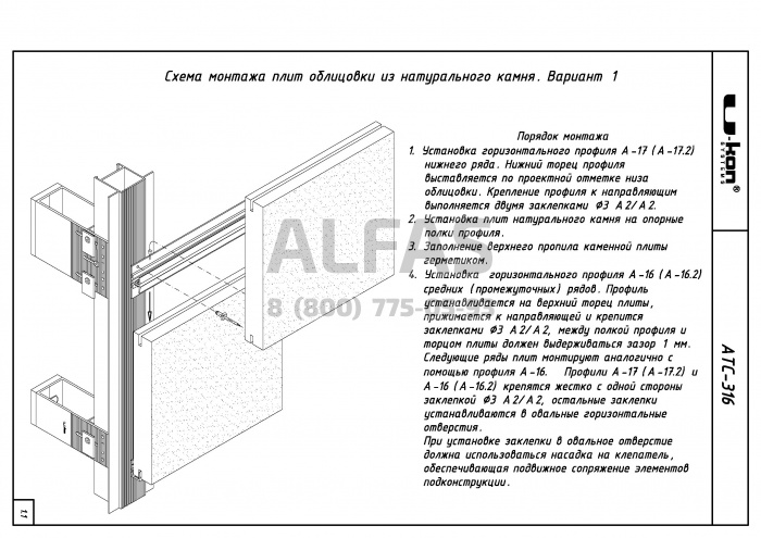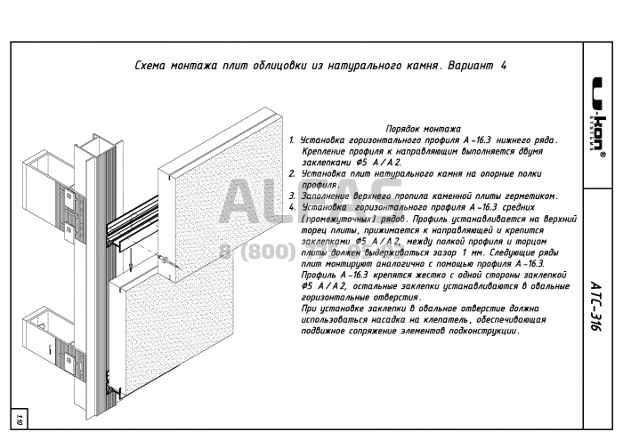 Система используется для крепления облицовочных панелей из натурального камня скрытым способом.