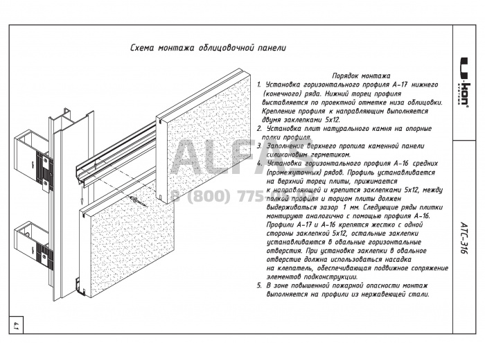 - Горизонтальная средняя А-16.Облицовка крепится на систему вертикальных и горизонтальных профилей. Облицовочные панели устанавливаются на горизонтальные направляющие, для чего в нижнем и верхнем торцах панели выполняется пропил, куда и заводятся специальные ребра горизонтальной направляющей.