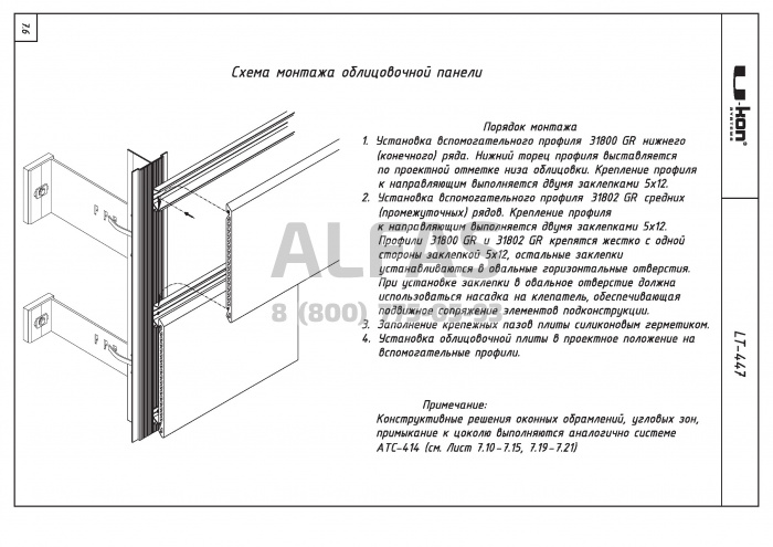 Облицовочные панели крепятся на систему вертикальных и горизонтальных направляющих. Горизонтальные направляющие крепятся к вертикальным алюминиевыми заклепками со штифтом из коррозионно-стойкой стали.
